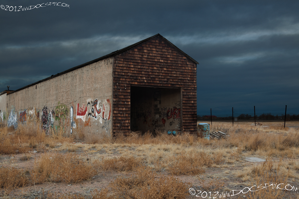 The west production building at sunrise. All three of these buildings have an area in the upper wall that are either bricked in or have an opening for piping.