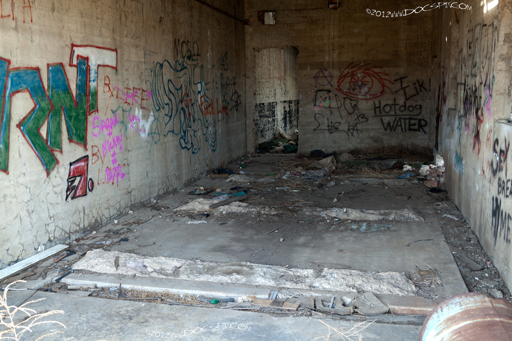 Inside the middle production building, looking west. Note the block wall on the left, and the poured concrete wall on the right.