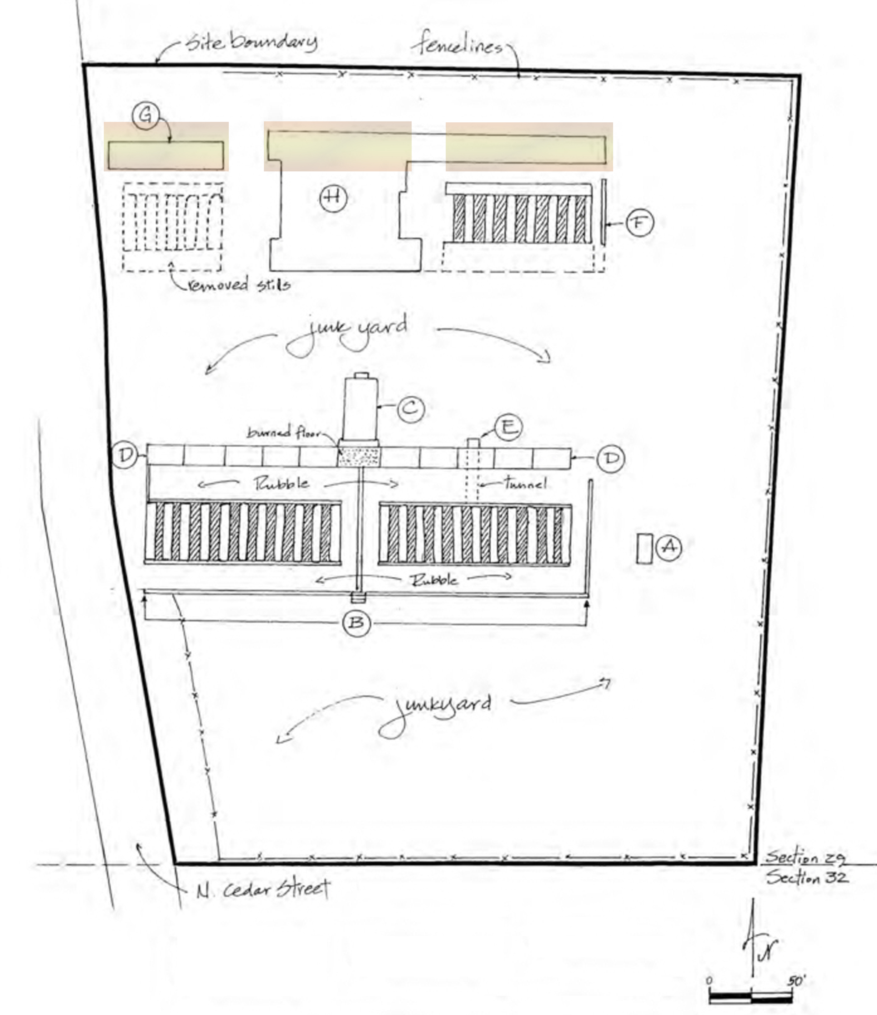 The Midwest/Standard refinery had two production lines that ran parallel to their respective stills. In all of these buildings, there were electric motors with large flywheels to pump the oil from still tank to still tank in order to heat the petroleum to varying degrees of temperature in order to produce different grades and products of oil; including gasoline, kerosene, motor oil, diesel fuel, and asphalt oil. The north production line and center bank of still foundations were incorporated into the U.S. Yttrium building during its construction in 1956. Unlike the south production line, the northern line was not a continuous building, it was made up of three different buildings. Each building served to help pump the oil for each of its still banks. Going west to east; the first building rests on the northwest corner of the LRCD property; is missing its west wall, has no roof, and has a tunnel that bisects it. The second and third buildings were joined together to provide a seamless transition for the yttrium operations and to provide additional enclosed storage for future use. These two buildings would receive the same green paint as the remainder of the building; the roofing would be replaced over the second building to match the transitional building/room. The rear building would receive a new roof and its east-facing wall would be replaced by a conventional garage door and facade.