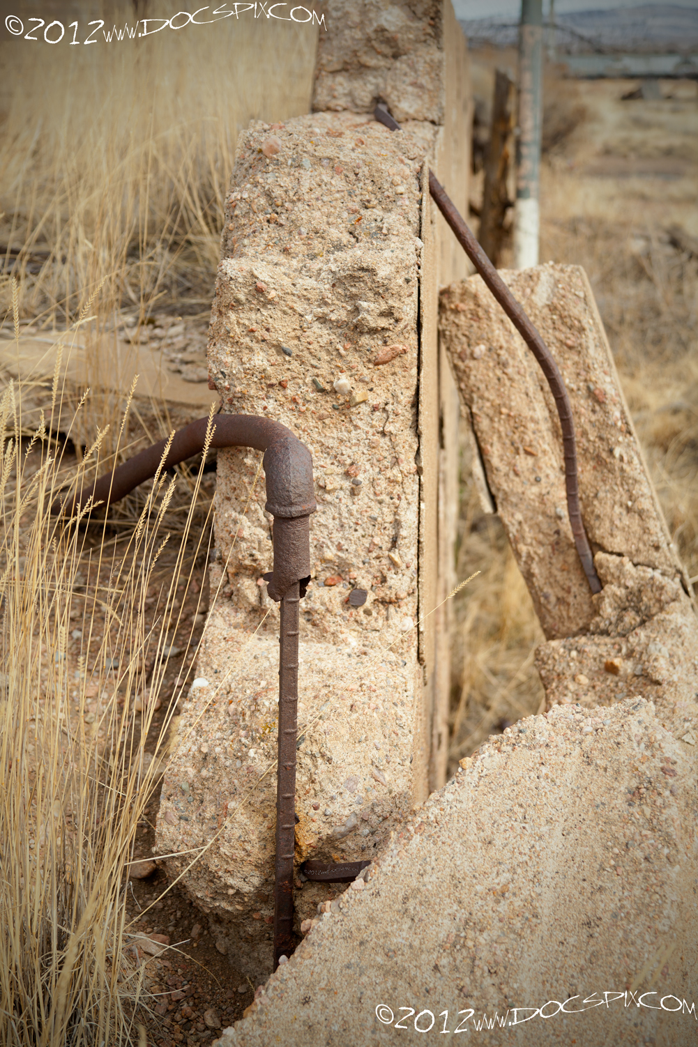 A wider view of the rebar on the pipe. Remnants of an old fence can be seen in the background.