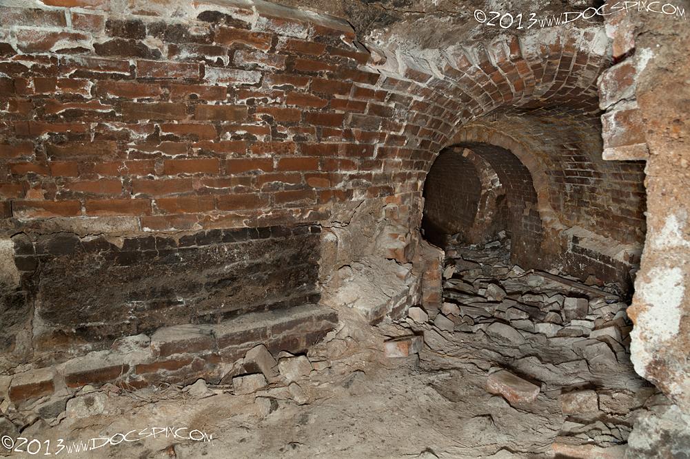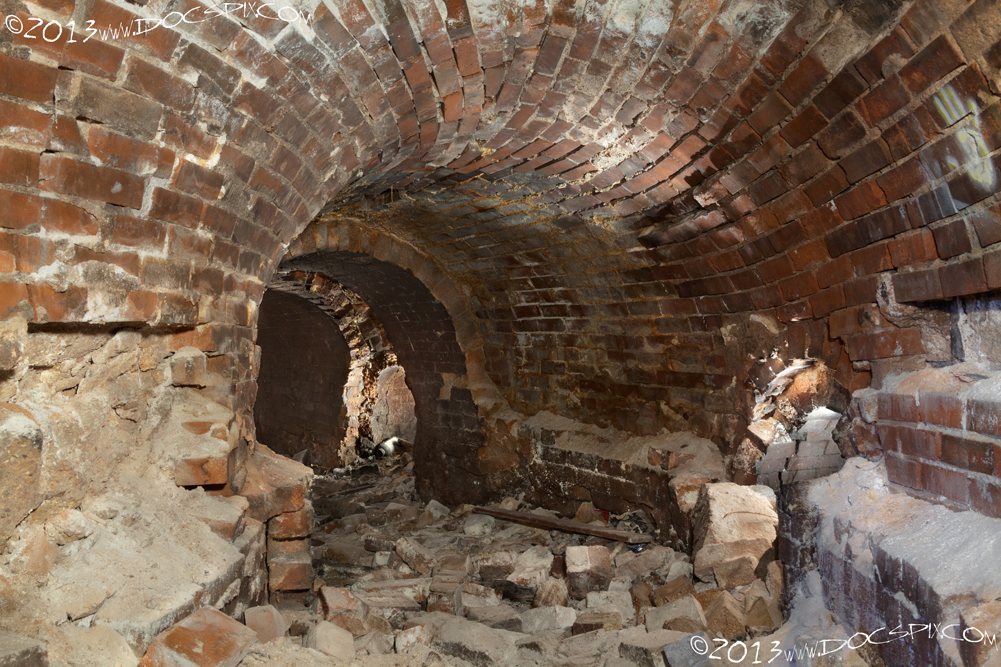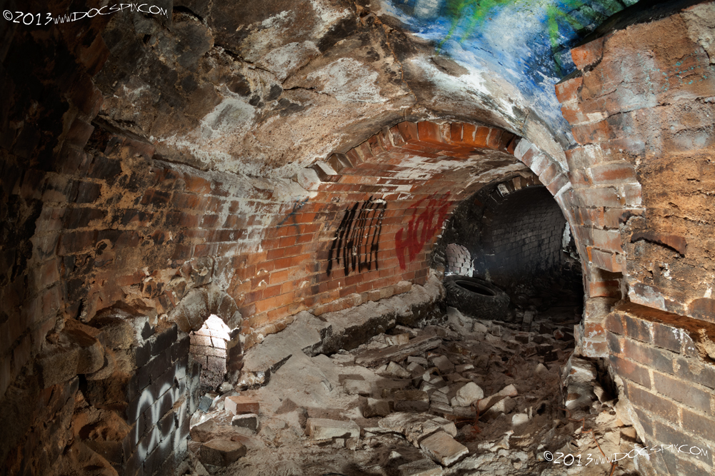 A view of the west tunnel. Note the flue on the lower left side; this was one of the six ventilation shafts used to expel the heat from the still operations; temperatures which may have reached as high as 800 degrees Fahrenheit, possibly higher.