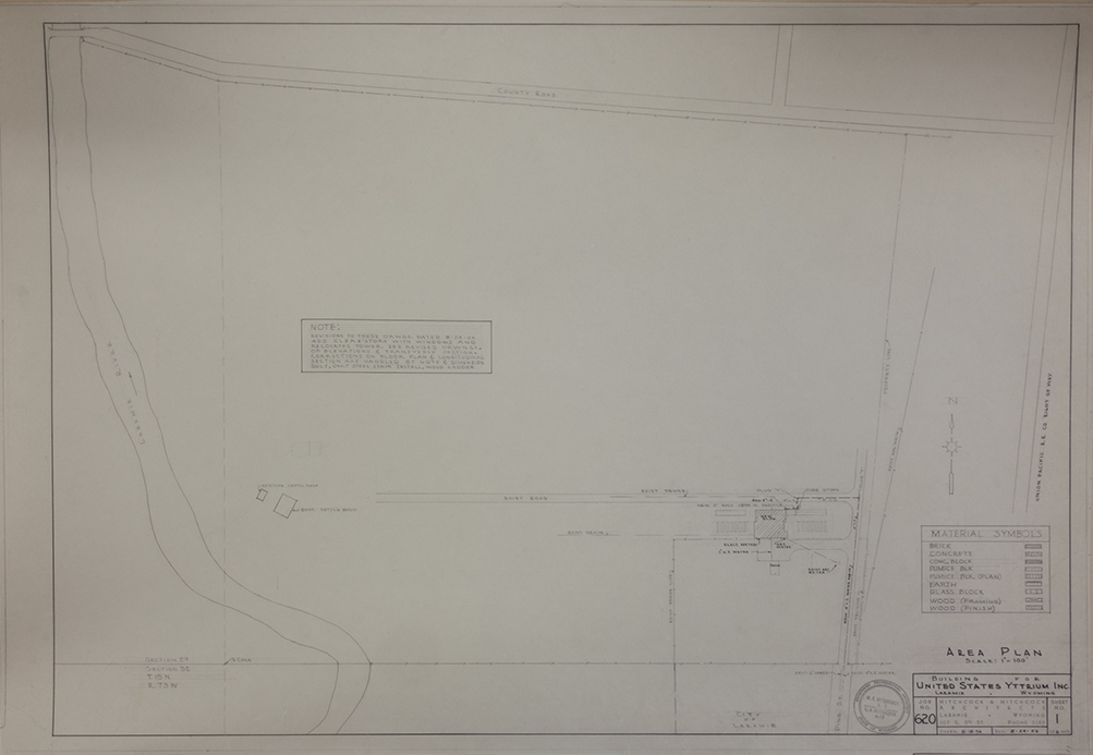 This plate indicates the placement and routing of various piping, storage tanks, and other machinery involved in yttrium processing.